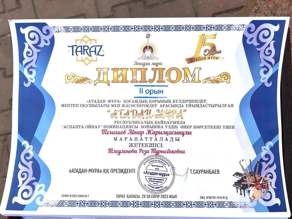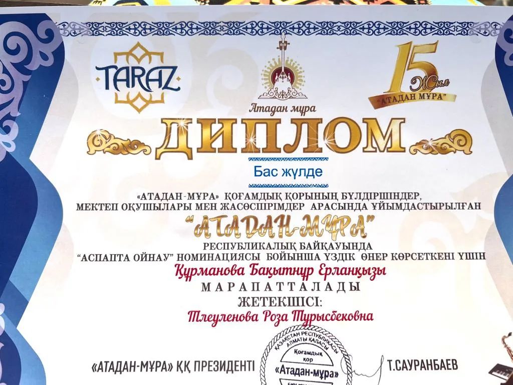 «Атадан-Мұра» қоғамдық қорының бүлдіршіндер, мектеп оқушылары мен жасөспірімдер арасында ұйымдастырылған " АТАДАН МҰРА" РЕСПУБЛИКАЛЫҚ БАЙҚАУЫНДА Тлеуленова Роза Турысбековна ҚҰРМЕТ ГРАМОТАСЫМЕН МАРАПАТТАЛДЫБас жүлде 🏆