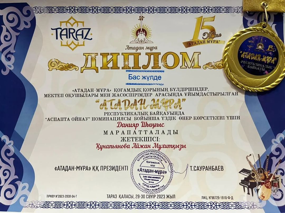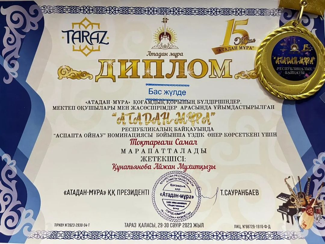 «Атадан-Мұра» қоғамдық қорының бүлдіршіндер, мектеп оқушылары мен жасөспірімдер арасында ұйымдастырылған " АТАДАН МҰРА" РЕСПУБЛИКАЛЫҚ БАЙҚАУЫНДА Құнапьянова Айжан Мухитқызы ҚҰРМЕТ ГРАМОТАСЫМЕН МАРАПАТТАЛДЫ
